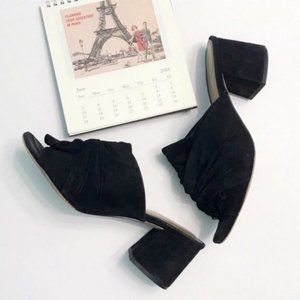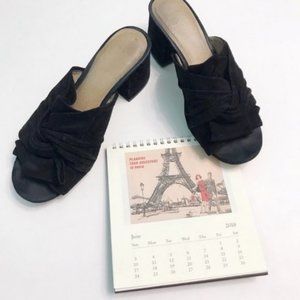 Black suede peep toe mule, block heel, knotted upper
