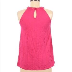 Halter style loose fitting tank with crochet neckline detailing in a fun pink color 95% viscose, 5% spandex