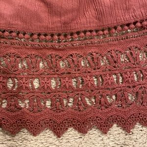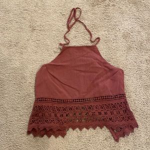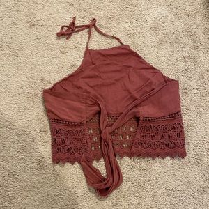 berry-colored and black halter tops from American Eagle, size medium. completely adjustable with tie back and tie neck. cute lace on bottom of shirt, like new condition!