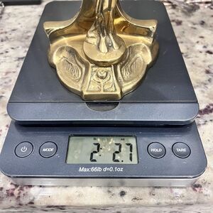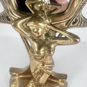The Art Nouveau cast Brass Mirror Stand with Lady Figurine is a stylish and ornate piece. Standing at 11-7/8" tall, this mirror stand features a beautifully crafted lady figurine in the Art Nouveau style, adding a touch of elegance to any room. Made of brass, this piece exudes a vintage charm that is sure to be a conversation starter in any collection of antique furniture.