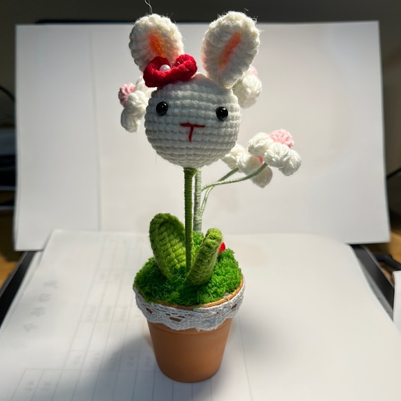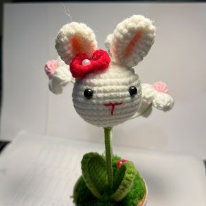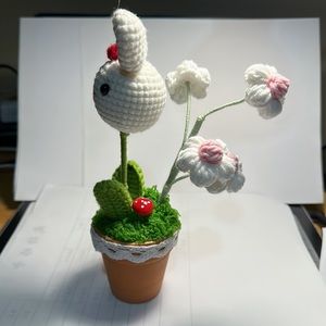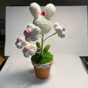 Little white rabbit in handmade woolen flower pot