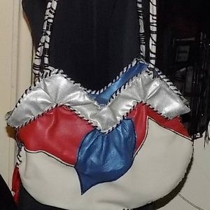 The main leather is beige. It also has black, blue, red, white and silver leather, finished with black leather-trim.