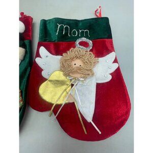 This set of 2 handmade Christmas mitten stockings, featuring adorable angel and snowman designs, is perfect for Mom and Dad. Crafted from red and green velvet, each stocking measures 13x10 inches. Please note, these items are preloved with slight fuzzing visible.