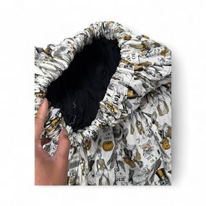 Charming handmade vintage Halloween skirt featuring an all-over novelty print with pumpkins, skeletons, and retro trick-or-treat motifs in muted gold and black tones. Full circle silhouette with a gathered elastic waist — perfect for spooky season styling or year-round statement looks.