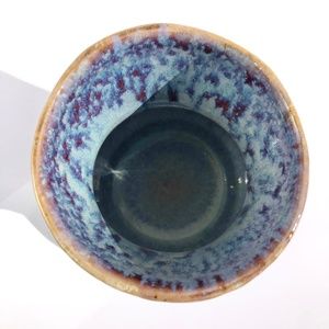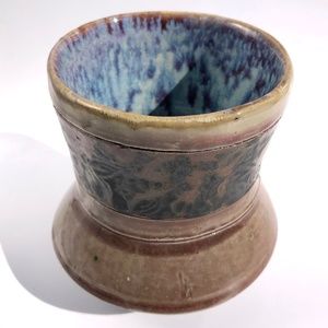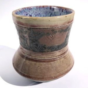 handmade pottery vase raku vessel leaves brown black blue drip 4 inches tall.