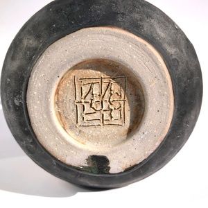handmade pottery vase raku vessel leaves brown black blue drip 4 inches tall
