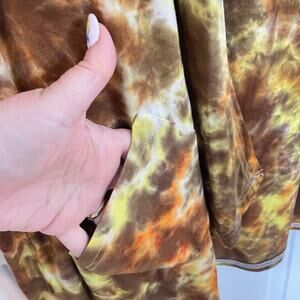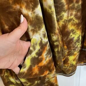 handmade tie dyed ladies' cardigan jacket in a galaxy mix of yellow, orange, and brown that reminds me of a giraffe or cheetah animal print