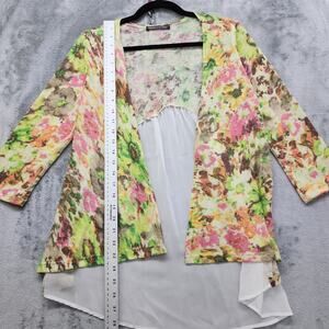 H.I.P. Happening in the Present Floral Knit Chiffon Open Front Cardigan Size S High Low Mixed Media 3/4 Sleeve Lightweight Pink Yellow Green Flowy Spring