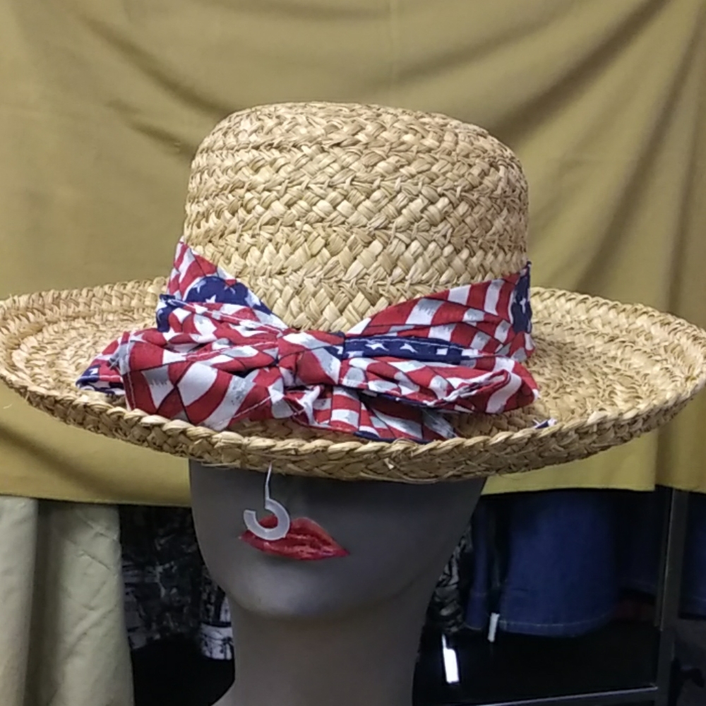 Straw hat with red white and blue ribbon