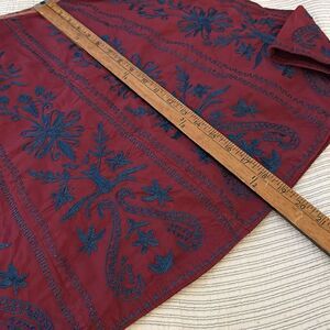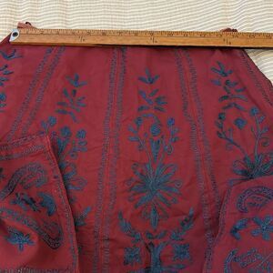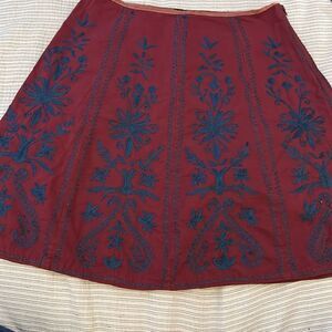 Elegant red skirt with intricate blue embroidery. Perfect for adding a touch of sophistication to any outfit.