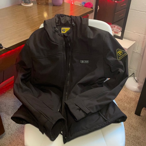 Heated jacket zip up. This hooded jacket has one strong battery that will keep you warm for hours. There are warming coils in the pockets and on the front and back! Only been worn a few times. THIS JACKET IS MEN AND WOMANS (unisex)