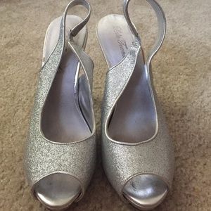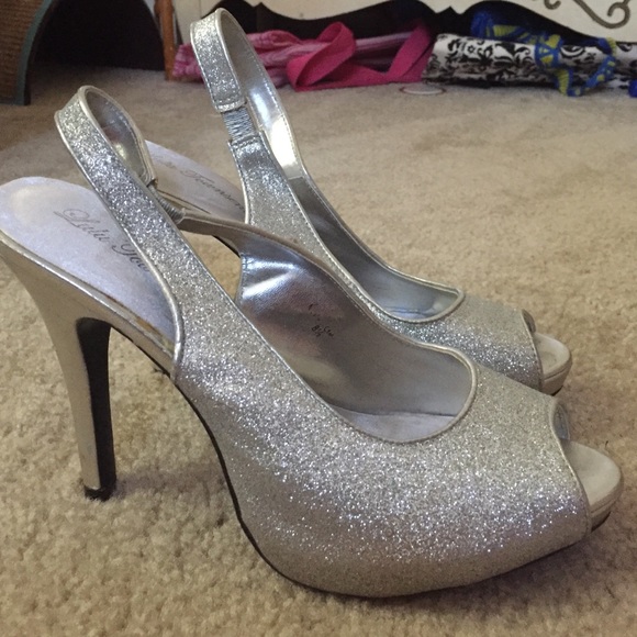 silver glittery peep toe size 8 1/2 4 1/2 inch heel. wore once for prom 5 years ago