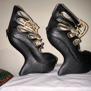 Black and gold ultra high platform wedge heels. Lace up cut out design snakeskin pattern zipper back closure.Platform 2 inches heel 6 1/4 inches size 8.5