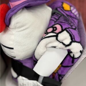 Charming Hello Kitty witch costume. Features purple hat and red bow. Perfect for Halloween fun.