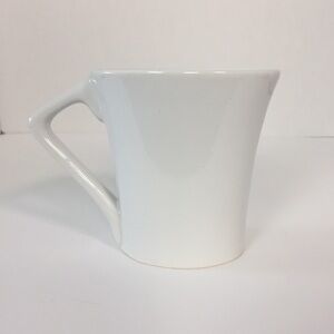 White ceramic mug with triangular handle. Oblong oval shape with tapering sides, brown lettering with red Xs and Os with red Hershey’s kiss graphic. Produced for Houston Harvest Gift Products LLC. Dishwasher and microwave safe. Hershey Foods Corporation.