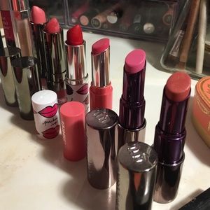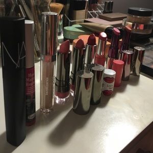 all high end!! a few have been tried on((-: this includes NARS lipgloss in the shade "get dirty", Matte liquid lipgloss from the balm in the shade "chivalrous", a shimmery lipgloss from bare minerals in the shade "diamond", 2 Lorac lipsticks in "girl next door" and seductress, a Clinique lipstick in the shade "matte Crimson", bare minerals lipstick in the shade "pink passion", and 2 urban decay lipsticks in the shades "obsessed" and "love light" 😊😊 willing to trade for other makeup!!