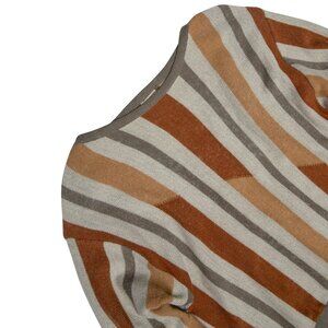 The Bauhaus-influenced pullover, attributed to Hipp Hipp and produced in West Germany, manifests as a rigorously composed synthesis of postwar continental craftsmanship and experimental intarsia logic. Its construction reflects a fiber-centric methodology, articulated through a chromatically calibrated sequence of warm ochre, rust, camel, and slate stripes that modulate across the garment with mathematical restraint. The yarn—likely an alpaca or brushed wool blend—exhibits a dry, low-loft hand characteristic of worsted spinning from Northern European mills, deliberately eschewing excessive softness in favor of tactile austerity and structural precision. This restraint informs the entire garment philosophy: surface texture is minimized, allowing chromatic partitioning to assume the structural role traditionally assigned to silhouette or embellishment. The saddle shoulder design eliminates the sleeve-head seam, enabling a continuous intarsia field that flows uninterrupted across the torso and arms—a decision that privileges spatial cohesion and aligns with the understated construction intelligence found in knitwear by Harley of Scotland and Pas De Calais. The neckline and hem, finished in low-tension ribbing, maintain a taut architectural clarity without imposing rigidity.