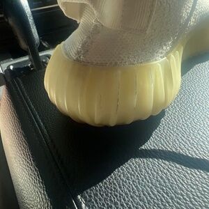The image shows a single white sneaker, identified as an Adidas Yeezy Boost 350 V2, resting on the passenger seat of a car. The shoe has a white Primeknit upper and a translucent, ribbed sole with Boost technology. The laces are also white, and the overall color is a "Triple White" or "Cream White" shade