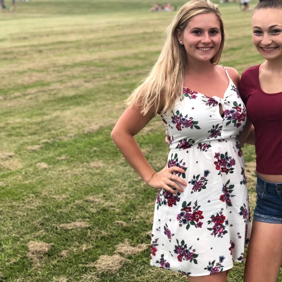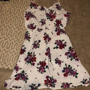 white dress with pink and red floral designs. dress is a size 4, but fits me perfect and i’m a small normally