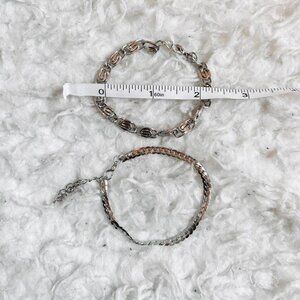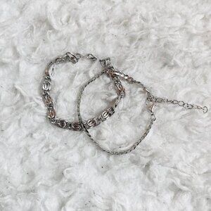 ♡ this is a pair of minimally-used, faux silver chain bracelets. brand is h&m. worn a handful of times, in excellent condition with no signs of wear! includes two faux silver chain bracelets. cute and versatile silver bracelets, perfect for layering. could be styled so many ways — boho, grunge, preppy, eclectic, coquette, goth, etc. adjustable chains, one size fits most.