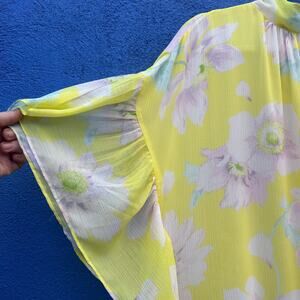 super dramatic, bold, and flowy with ultimate 60s vibes / perfect for a fashionable day of lounging or an elegant cocktail party / ruffle detail from sleeves down the sides and a tie at the back of neck / oversized caftan cut / flowy lined chiffon / excellent preowned condition