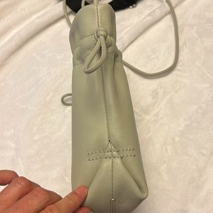 Questions? Leave a comment below! This J.Crew Mini Crossbody Lisbon Leather Drawstring Bucket Bag in Soft Green is a must-have! With a solid pattern and smooth finish, this lightweight bag has a rectangular shape and measures 7 inches in width, 8 1/2 inches in height, and 2 3/4 inches in depth. It comes with a long crossbody strap measuring 22 inches in strap drop and features a drawstring closure for convenience.