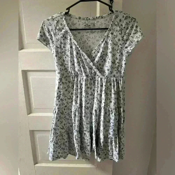 women's size extra small white and baby blue flower print dress tight at the top flowy at the bottom