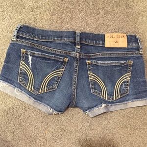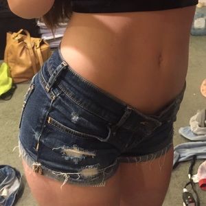 low rise hollister shorts, fit very comfortably at hip, very cute and comfy! dark navy denim color and rips distressed look, one of my favorites but just don't fit anymore! -MAKE AN OFFER! PRICES ARE NEGOITABLE!-