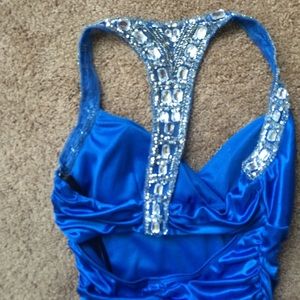 blue silk, ruffles on the back, open back, silver rhinestones all over the top of the back