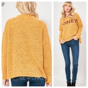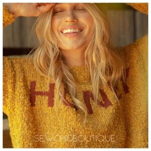 A long sleeve sweater in textured popcorn knit with knitted in pattern that reads ‘Honey’ in block letters. This graphic sweater also features a relaxed fit design with round neckline and dropped shoulder. The cuffs of the sleeves are thickly ribbed matching the bottom hemline & round neckline. This sweater is soo soft & I just love it.