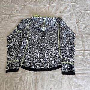 Title Nine cotton/poly knit sweater. Hood is double lined with lime green. size M. Black and white pattern with lime green accents. Double zip, very soft, cold-water wash.