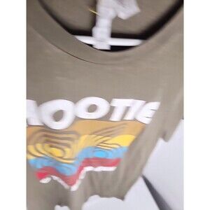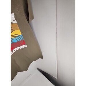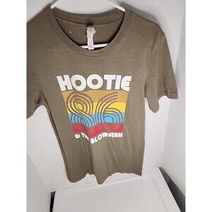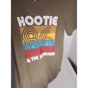 This brown t-shirt with a graphic print featuring the logo of Hootie and the Blowfish is a vintage piece that will surely make a statement. With a crew neck and short sleeves, this shirt is perfect for all seasons and can be easily maintained with its machine washable fabric. It is made of a cotton blend material that stretches for a comfortable fit, making it a great addition to any casual outfit. This shirt is perfect for men who love bands and the 90s theme. It is available in size small and is a regular fit.