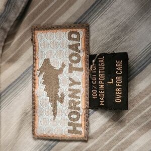 Gray with blue and tan stripes Horny Toad long sleeve casual button down shirt. Size Large. 100% Cotton. In excellent condition.