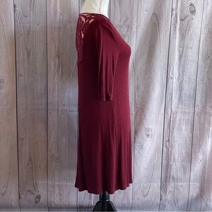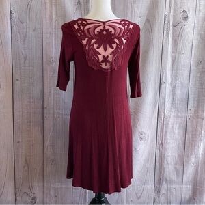 This dress is in like new condition as it was only worn once. It is 95% rayon and 5% spandex. It is a hand wash item. The back is a sheer lace design and it has 3/4 sleeves. It is a maroon color. I wore it to a wedding with a cardigan. This is a great looking dress for any occasion.
