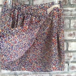 Brand new with tags! Wrap skirt with elastic waistband with ribbon detail and hidden zipper closure. Bright colorful design with navy blue, coral, pink, and yellow. Versatile skirt can fit a small as well.