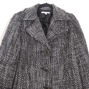 CAbi black/white/grey tweed peacoat jacket. Sits above knees of course your height may alter that so please see measurements. Has large button closures and 2 pockets with a 9" slit in back. Tweed has tiny bit of fuzz.