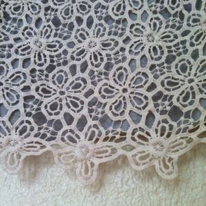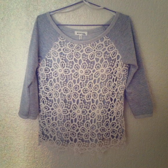 Perfect for those windy spring days in Cali. This crop top is a jersey knit, 3/4 sleeve, with the floral lace. Super cute! I always got lots of compliments for it. Clean. Snug sleeves