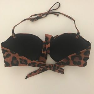 Leopard bikini top that is strapless and comes with straps! Super cute bow in the middle. Never worn (only tried on) with no tags! Size 10