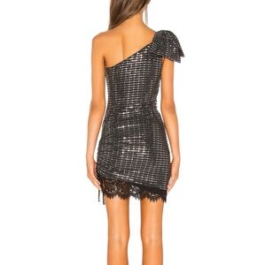 Stunning one-shoulder mini dress. Features black and silver sequins. Lace trim adds elegance.