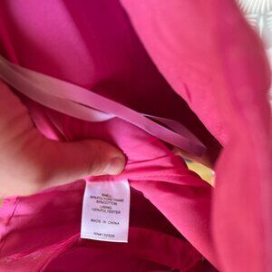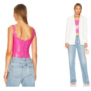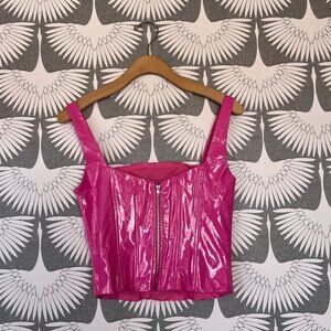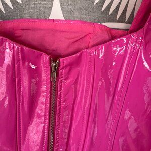 Exposed back zipper closure. Boned bodice. Faux patent leather fabric