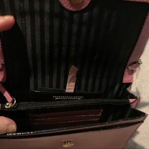 Front snap closure. inside middle zipper pocket and 3 cards holder slots. slip pockets at back and front