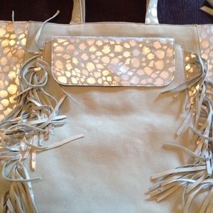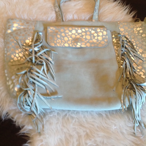 Super large pocketed, out and in! Fringe ...very pale green silver metallic cheetah accents! Genuine suede