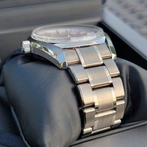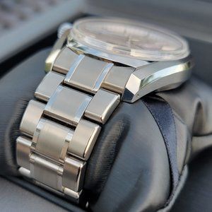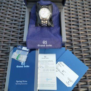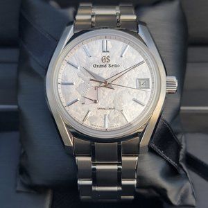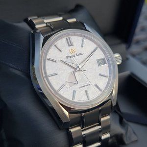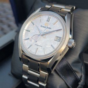 Offering super desirable Grand Seiko SBGA413 SHUNBUN dubbed as "FOUR SEASONS" . The dial of this piece is a true star! One of the unique things about the four-season collection watches, is the effort put in making sure the dials are exquisite and unique. The Grand Seiko SBGA413 is no exception, and its dial is a testament to this! The dial reminds you of the spring sakura season in Japan which is characterized by flower petals floating on water. This piece is perfectly complemented by manufacture caliber 9R65 spring drive which provides extreme precision which can be witnessed by perfectly smooth glide of the seconds hand. This timepiece has very respectable power reserve of 72hrs, put it down on Friday and its still going strong on Monday. Watch case and bracelet is made from high intensity, scratch and corrosion resistant titanium which feels remarkably light. This timepiece is made very well, with great attention to detail which can be seen upon close inspection.