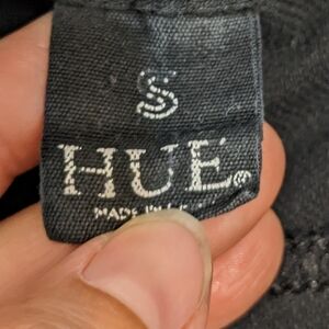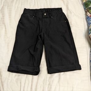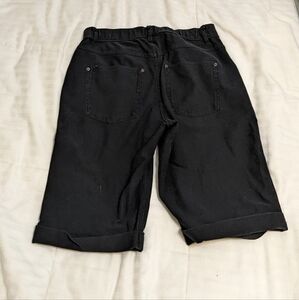 Hue rolled edge black Bermuda shorts size small. the waist is elastic, the front pockets are fake but there are 2 back pockets. if you like Hue I have several pairs of them in similar size and style in my closet. Bundle any 2 items and save 50% off the whole order. 81% cotton the rest is polyester and a little bit of spandex. they are nice and soft and stretchy