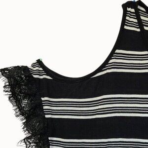 iJeans by Buffalo are so affordable and so adorable! Measuring 22" chest from pit to pit 22" Back Length of 24-1/2" and 14" across the shoulders. Made of 95% rayon 5% spandex, this top has a lot of stretch. Black and white horizontal stripes with black lace at the arms.