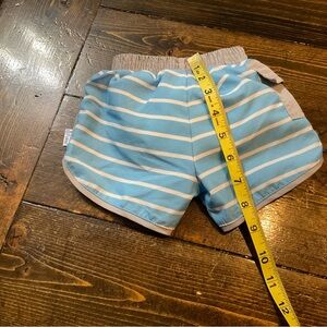 Stylish swim trunks with blue and white stripes. Features a comfortable elastic waistband and side pocket. (BIN000)