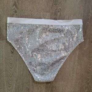 iHR/Cherry Mellow silver sequin booty shorts (mid-rise) with white elastic band and white plastic buckle detail. Excellent condition! Fuller coverage back. Size small. 100% polyester lining.