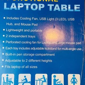 IMounTEK Multifunctional laptop table – includes cooling fan, USB light (3 LED), USB hub, and mouse pad – lightweight and portable – 2 independent trays, perforated cooling fan for laptop and large mouse pad – each tray includes adjustable kickstand for multi – angle use, built-in pen, storage compartment, adjustable to two different heights, fits laptop of all sizes.
