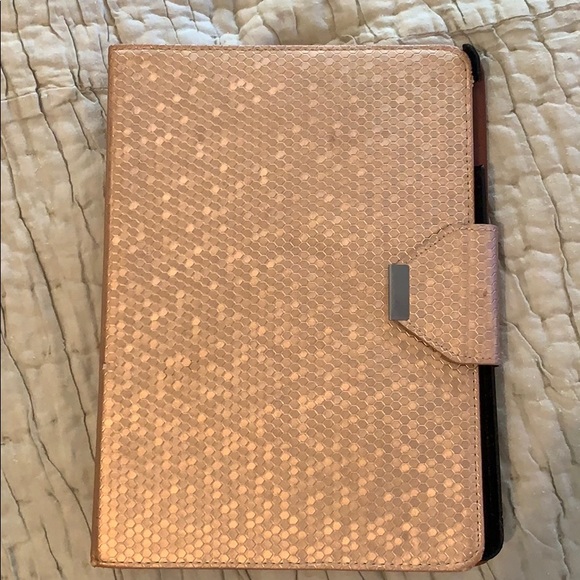 Barely used. Rose gold metallic case. Has card holders, magnetic lock, hard inside shell casing.