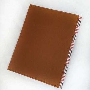 Fits up to 10.1". Herringbone design and caramel cooler leather. Likely faux leather. Soft interior. Dimensions are 8x10.5x0.57 inches. Fits up to 10.1" iPad.